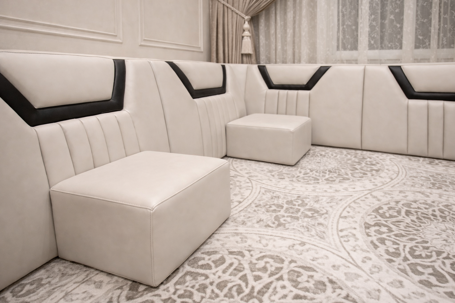 ارفع مستوى مجلسك في الرياض مع هذا الطقم الأرضي على شكل حرف U، يتميز بتنجيد بيج ولمسات سوداء لمسة عربية حديثة.