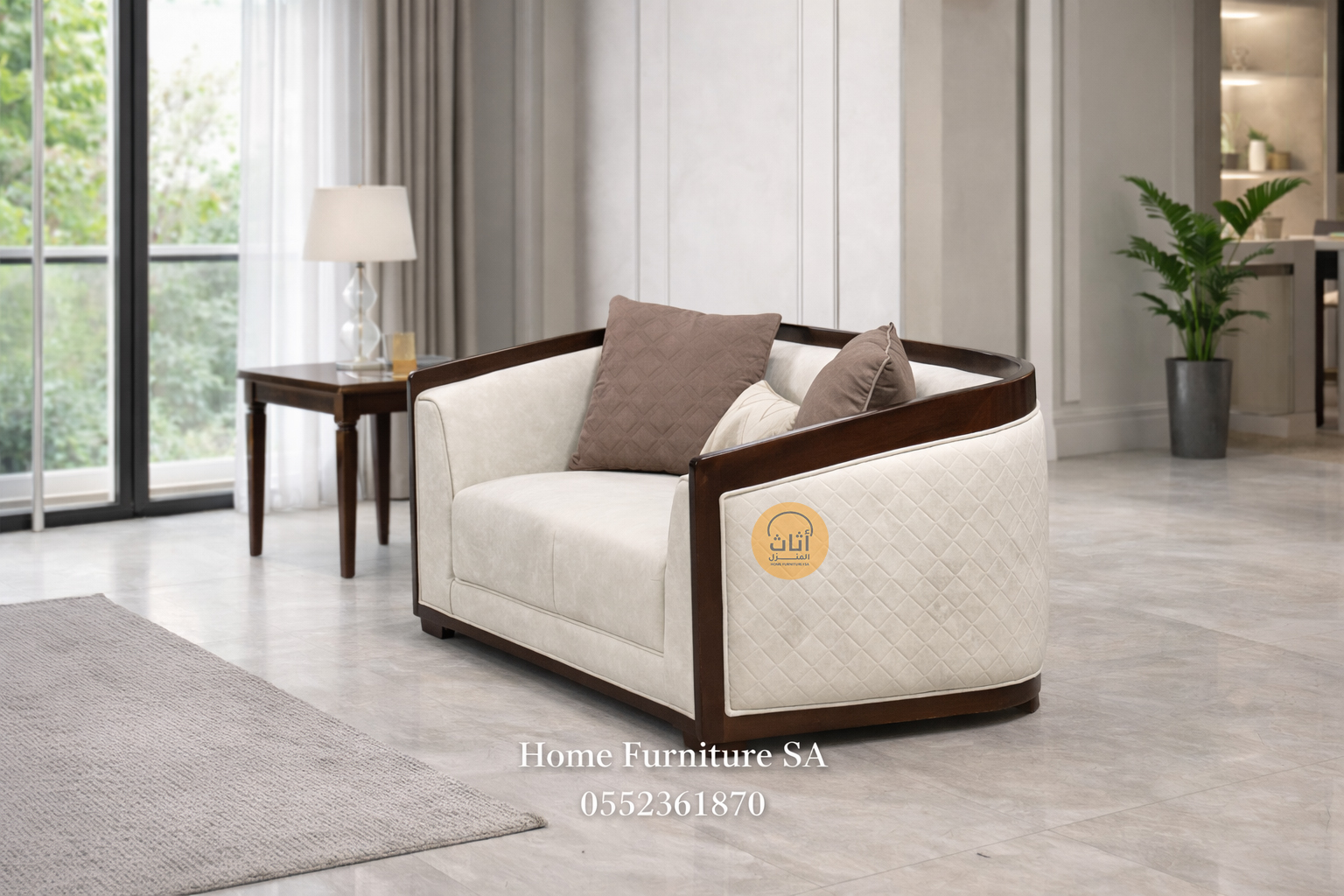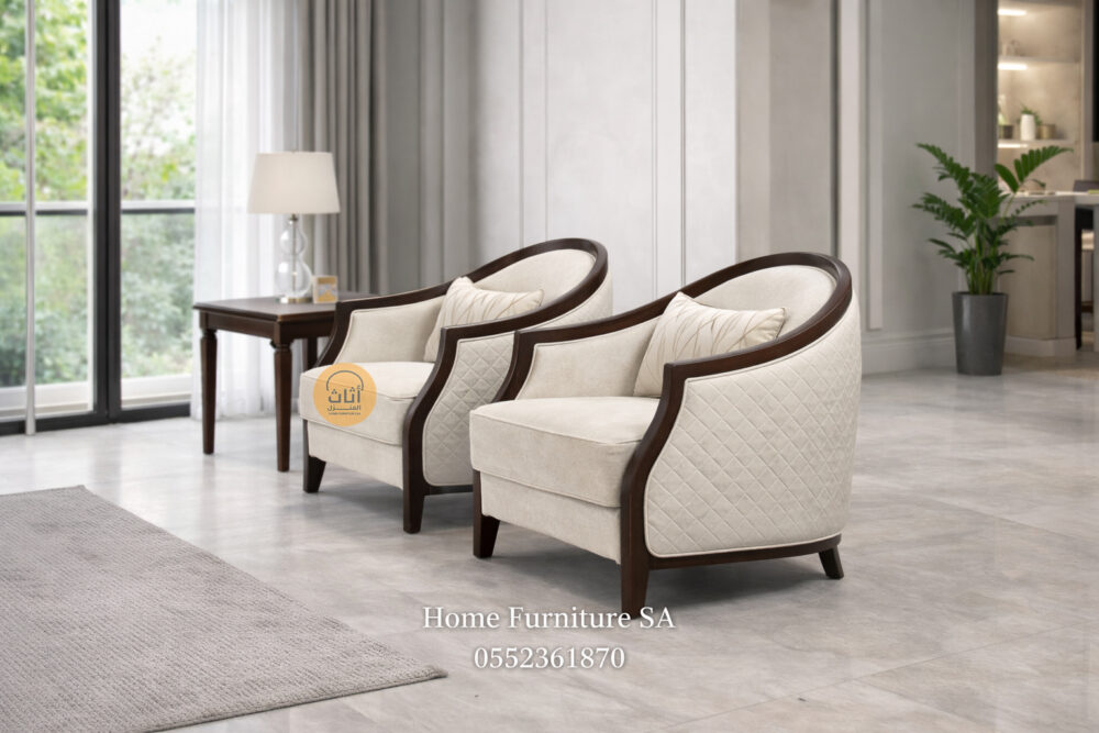 مقاس متوازن. عمق جلوس مريح. إطار خشبي قوي. تشطيب قماش مناسب لمنازل الرياض. توصيل محلي مع دعم الصالة.